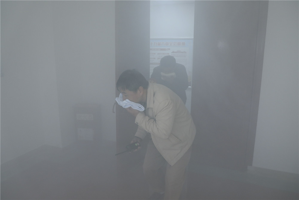 煙霧在樓層中彌漫開來,空氣里傳來濃烈刺鼻的氣味,在人工煙霧制造的“著火現(xiàn)場”背景下,大家按照緊急疏散的程序和要求,遵循“左手用毛巾捂住鼻子、嘴巴,右手扶著墻壁走”的規(guī)范姿勢,在安全疏導(dǎo)員的指揮下有條不紊地從安全通道撤離,各單位員工一個不少的有序集中在辦公大樓前的安全地帶。整個演練活動達(dá)到了預(yù)期效果,取得了圓滿成功。