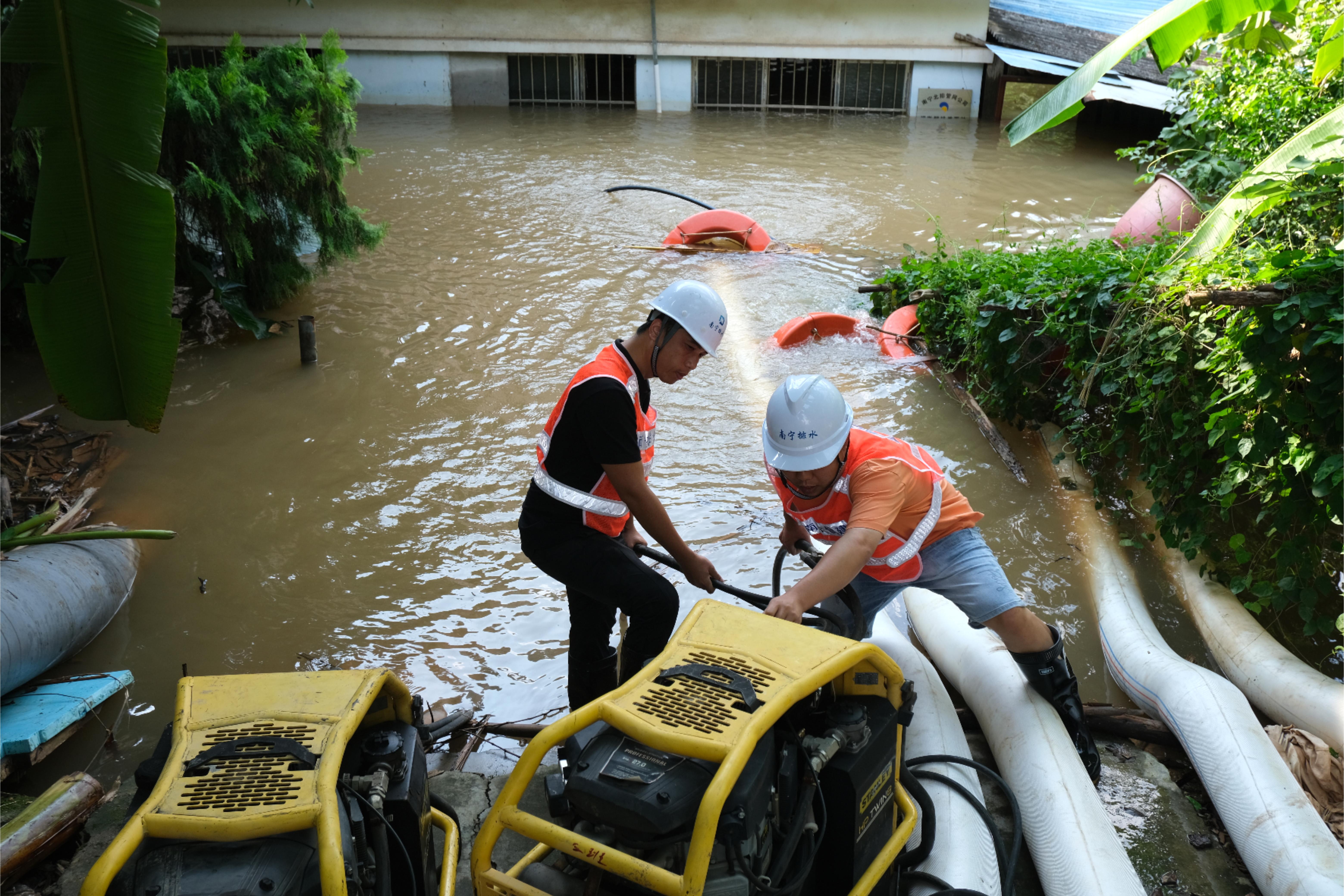 受來(lái)勢(shì)洶洶的洪水影響,水塘江附近的煙墩嶺片區(qū)江水倒灌,部分居民樓受淹。9月11日凌晨2點(diǎn),南寧市排水公司接到情況反饋后,由黨員陸航宇帶頭,立即組織黨員先鋒隊(duì)前往煙墩嶺片區(qū)進(jìn)行排澇工作,共投入3輛液壓動(dòng)力站,1輛“迪沃”抽水車,1輛“龍吸水”抽水車,合計(jì)15人參與該處的排澇工作。現(xiàn)場(chǎng)機(jī)械24小時(shí)不間斷抽水,黨員們分秒必爭(zhēng),幾乎吃住都在現(xiàn)場(chǎng),經(jīng)過(guò)60多個(gè)小時(shí)的抽排,13日下午17時(shí),現(xiàn)場(chǎng)水位已明顯下降。